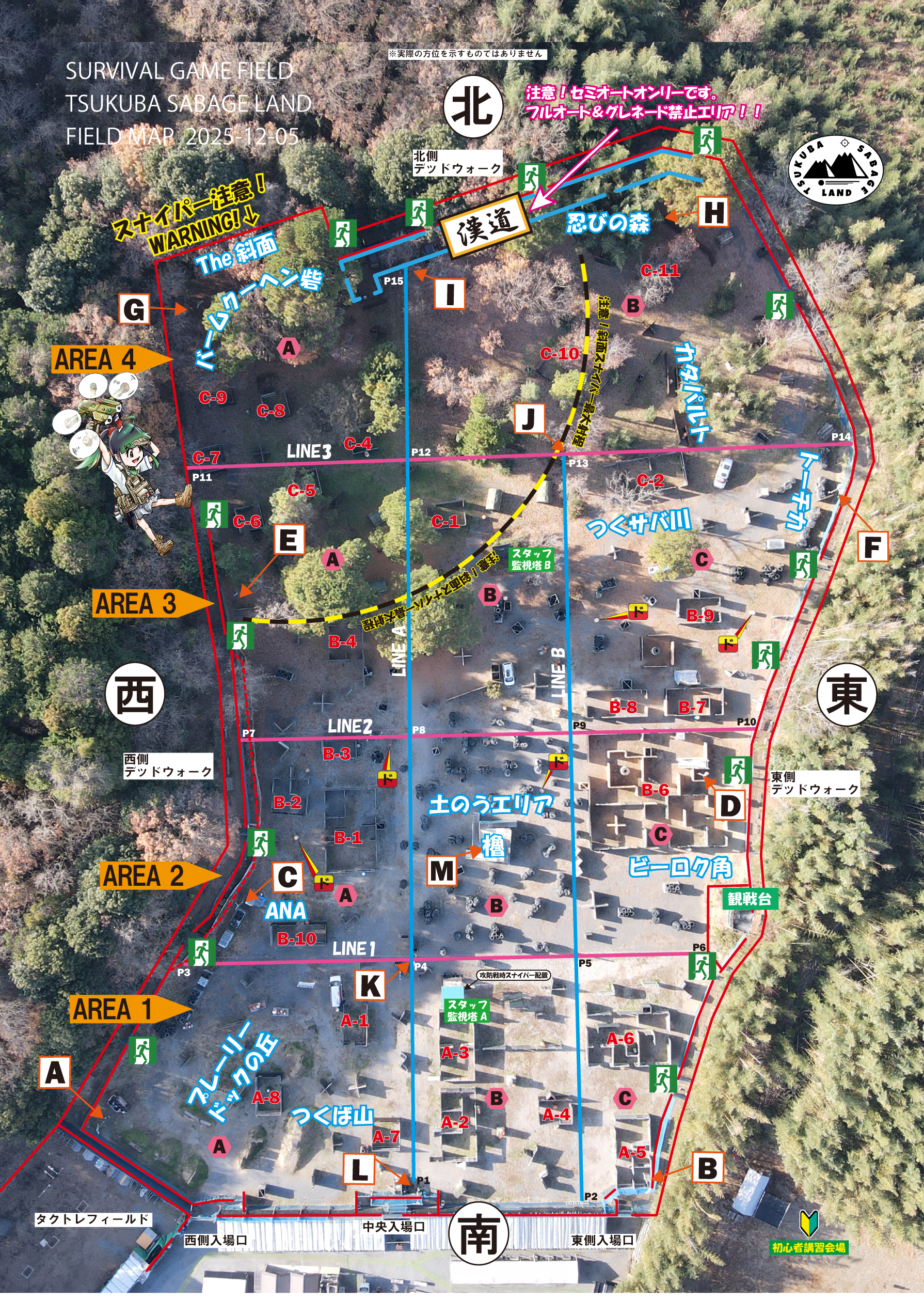 つくサバのフィールド 茨城県龍ケ崎市にある「つくサバ」は、県下最大級! つくサバは「初心者とベテランさんの力の差を可能な限り埋める」「体力の差を可能な限り埋める」ことがフィールドコンセプトになっています。145m✕横90mの大型フィールドです。移動するごとにキャラクターが変わる飽きのこないフィールドをお楽しみ下さい! AREA1 AREA2 AREA3 AREA4