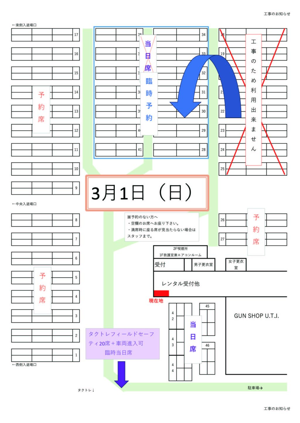 先般ご報告申し上げた通り、2026年3月1日(日)は、セーフティ18番から25番まで当日作業が行われるため、利用が出来ない状況になります。